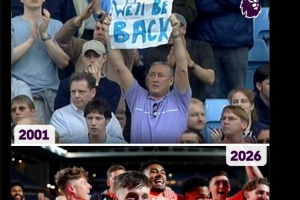 英超官方社媒晒出考文垂2001年、2026年的对比照片,对考文垂表示祝贺。2001年的照片中,考文垂球迷举起的标语写着:“我们会回来的!”